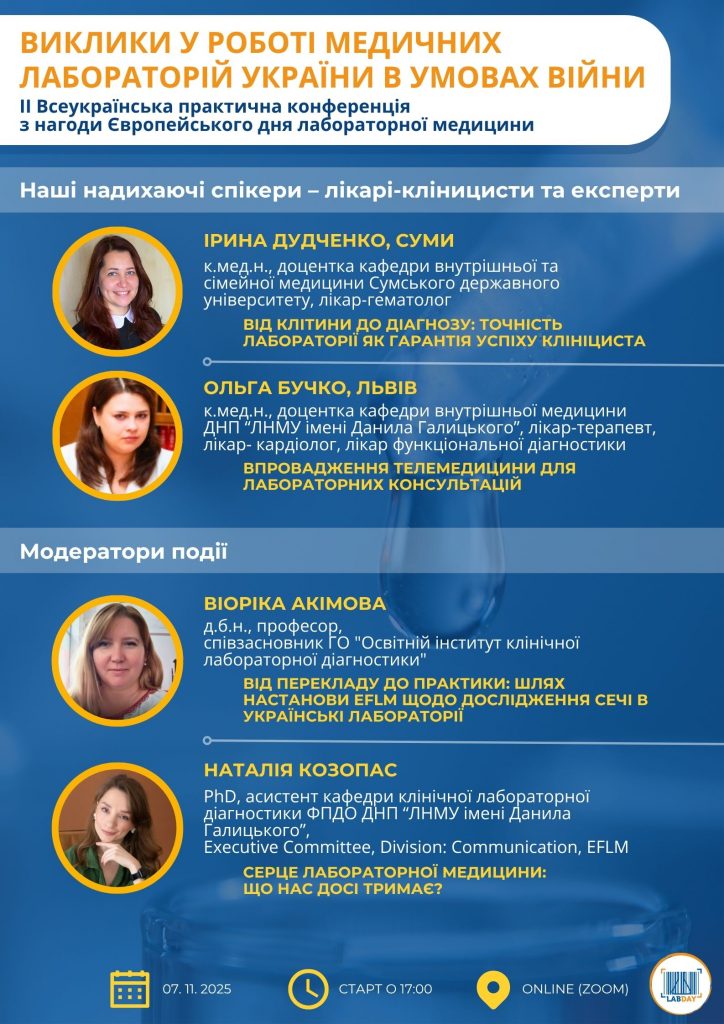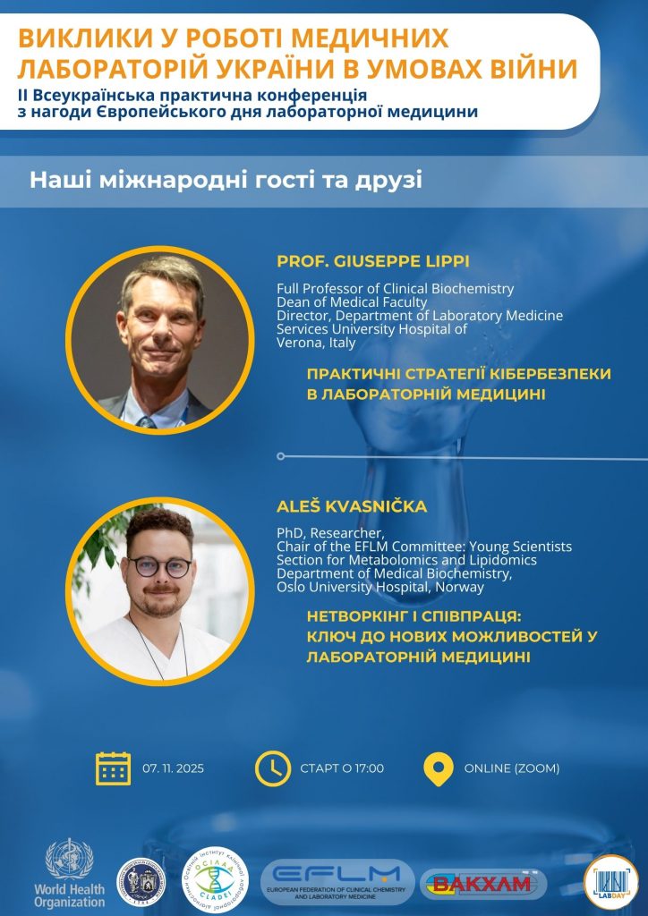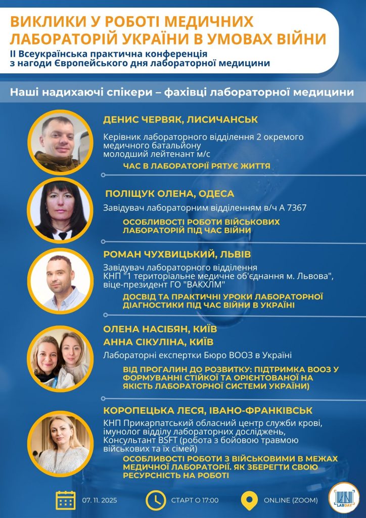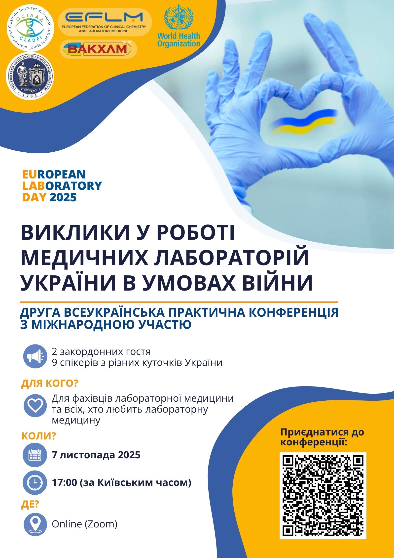 Запрошуємо всіх зацікавлених до участі у ІІ Всеукраїнській практичній онлайн конференції з міжнародною участю «Виклики в роботі медичних лабораторій України в умовах війни» (до Європейського дня лабораторної медицини), яка відбудеться  7 листопада 2025 року (п’ятниця) протягом 17:00–19:40 в онлайн-форматі (Zoom).